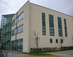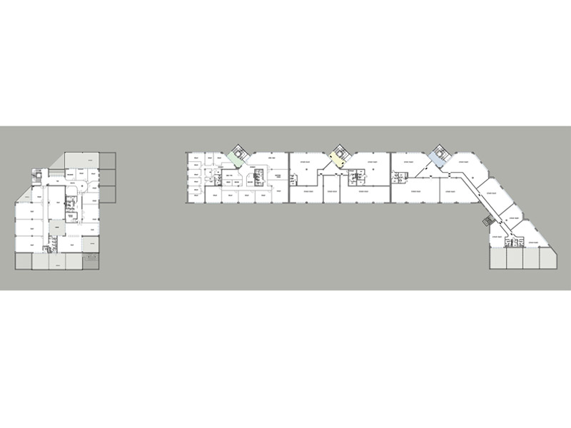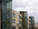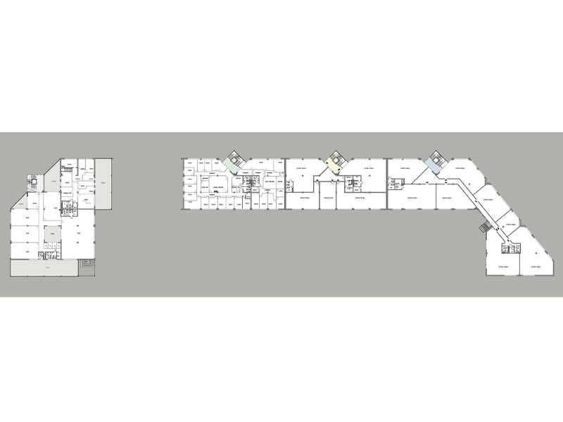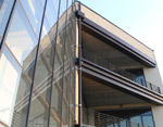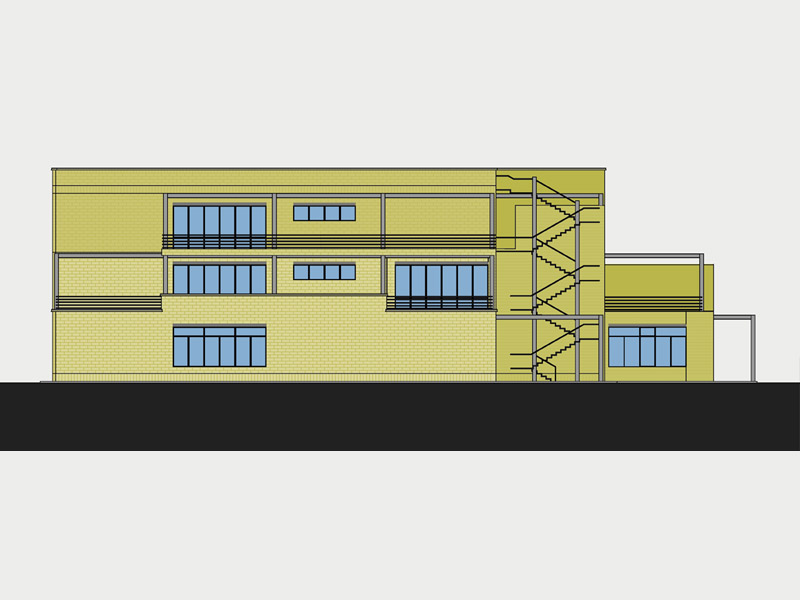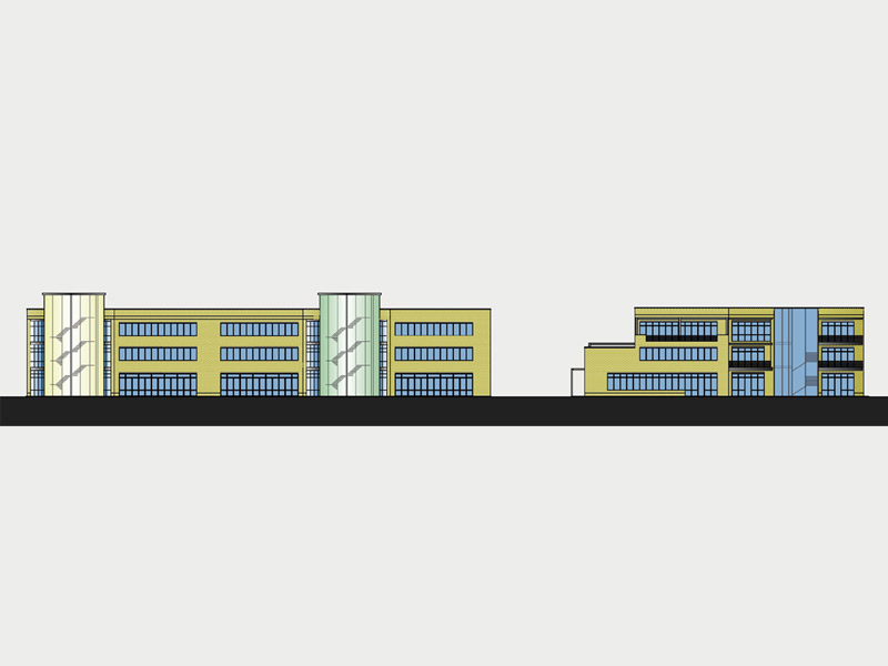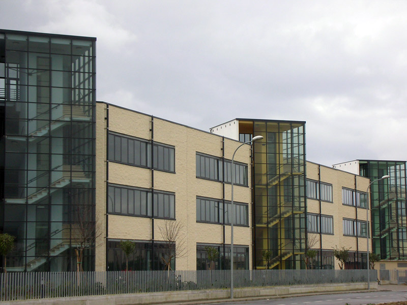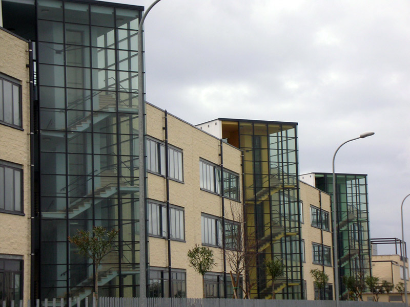 Il tamponamento esterno dell’intero complesso si presenta in modo uniforme poiché mostra solamente due materiali principali: il vetro che conferisce trasparenza e “permeabilità” tra interno ed esterno e la muratura a faccia vista in blocchi splittati colore giallo Firenze con ricorsi orizzontali e verticali che favoriscono il rapporto con le altre linee della facciata, con gruppi scale delimitati da vetrate continue e distinti ciascuno con una diversa gradazione cromatica.