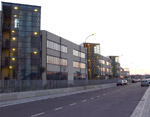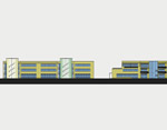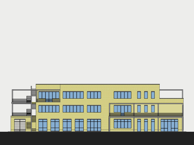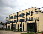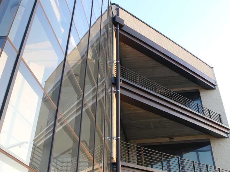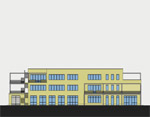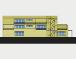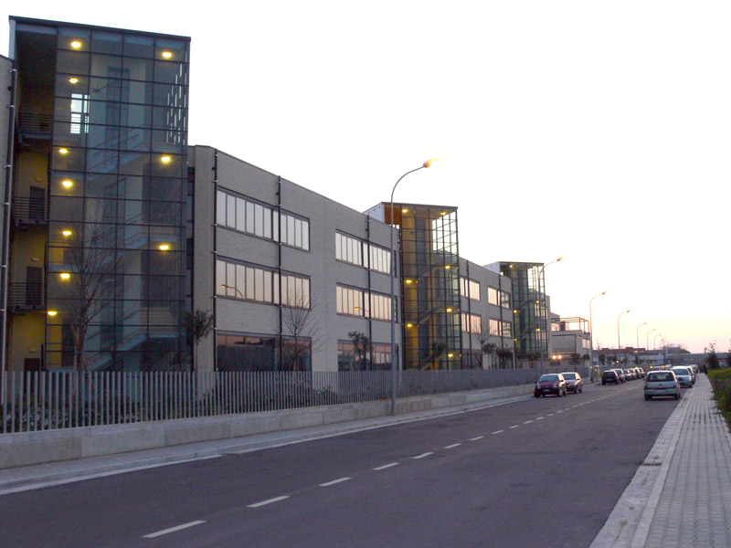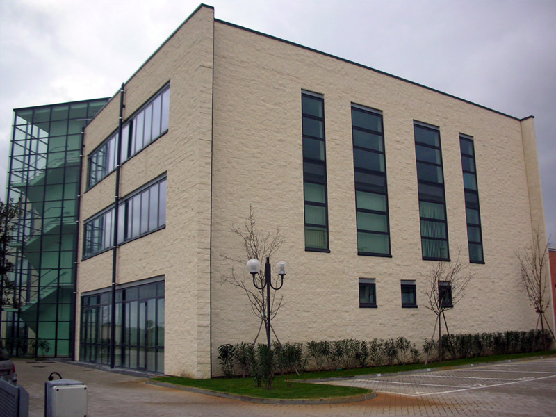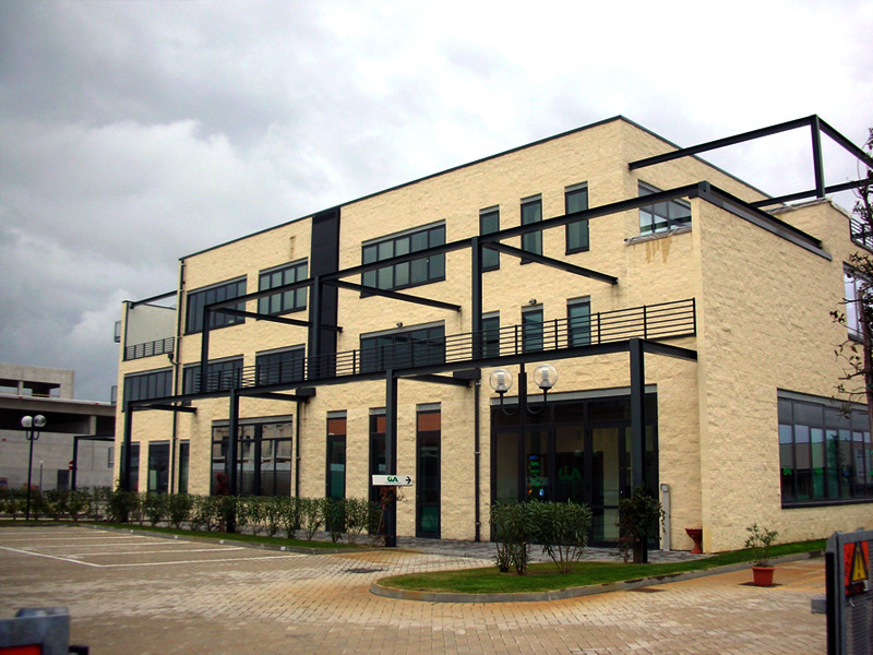 La caratteristica edilizia dell’edificio, notevole sviluppo del fronte e limitata altezza, rischiava di appesantire l’immagine esteriore e questa preoccupazione ha portato alla scelta di definire ampie superfici vetrate e alcuni elementi geometrici, avanzati rispetto al fronte edificato, in vetro che contengono i corpi scala; questi scaricano trasparenza e danno al complesso maggior leggerezza; lo stesso si presenta con linee geometriche ben definite e la copertura interamente piana che ne consente l’utilizzazione a terrazza nelle zone laterali trovando luogo tutte le apparecchiature impiantistiche di termo-condizionamento e quant’altro necessario.