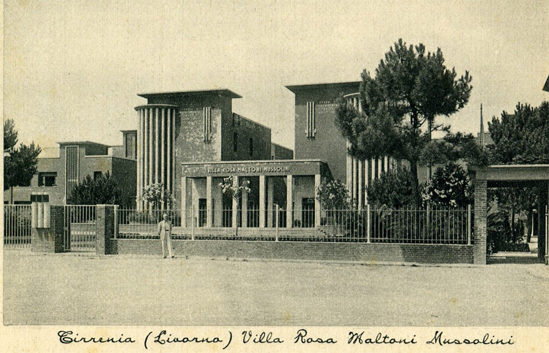 Il complesso coloniale meglio conosciuto come Villa Rosa Maltoni Mussolini risulta essere l’edificio dimensionalmente più rilevante del litorale pisano; realizzato nel 1932/35 su progetto dell’Arch. Angiolo Mazzoni; l’edificio, orientato parallelamente all’asse stradale si sviluppa tra cilindri, cubi e parallelepipedi in cemento armato di altezze diverse. Staccati dall’edificio principale, si elevano due serbatoi cilindrici attorno ai quali si sviluppa una stretta scala esterna elicoidale definita da De Chirico e da Carrà un chiaro richiamo metafisico.